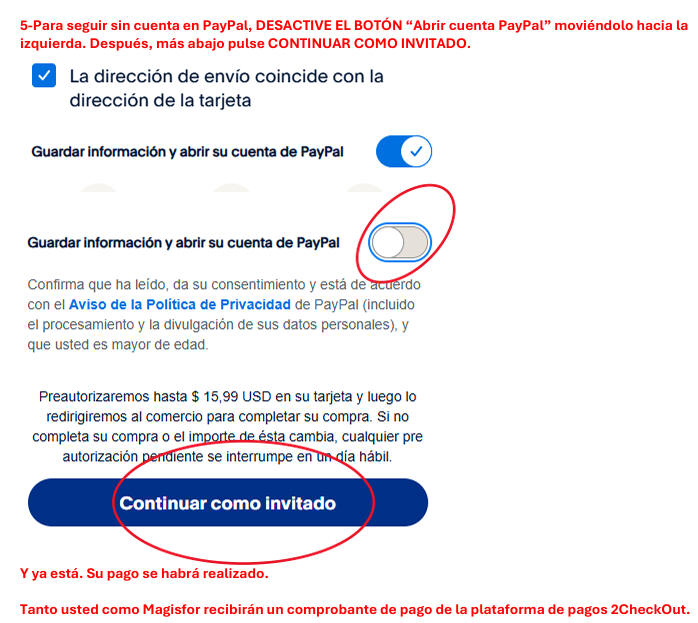 Todos los pagos con Visa/Mastercard/Diners/Amex se procesan a través de PayPal: ya sea usando una cuenta de PayPal o realizando el pago como invitado con la opción 'Pagar con tarjeta de débito o crédito'.