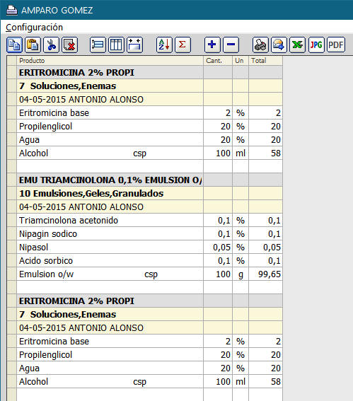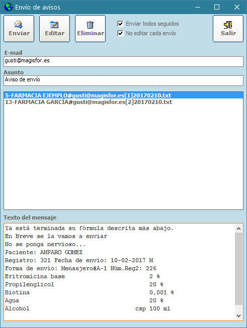 cada farmacia cliente cuya(s) fórmula(s) ya están elaboradas y