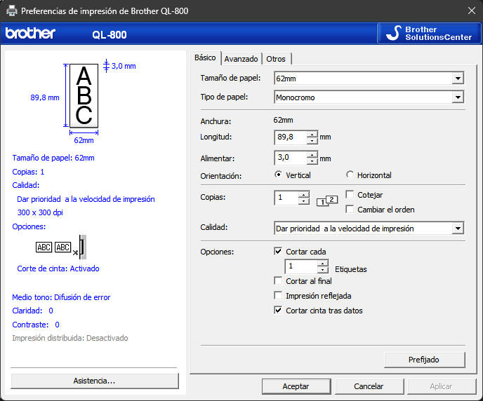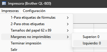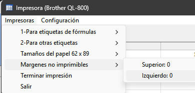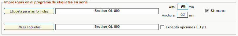 IMPORTANTE: Con la Brother QL-700 (o superior) , en "Preferencias de impresión" hay una opción muy importante: "Cortar cinta tras datos". Si su rollo de etiquetas es continuo, y está imprimiendo en VERTICAL, la Brother QL-700 (o superior) corta la etiqueta 3 mm por debajo de la última línea de la fórmula sin dejar espacio en blanco. Esto es una gran ventaja y un ahorro grande de papel.