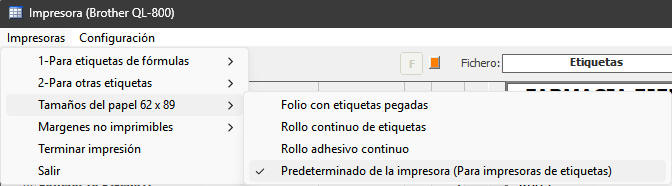 Con la nueva opción "Tamaño predeterminado de la impresora", el programa crea automáticamente un formato a partir del tamaño de etiqueta que tenga definido el controlador de la impresora. Esto quiere decir que para cambiarlo, el usuario deberá hacerlo desde dicho controlador (panel de control de Windows => Impresoras), y los formatos del programa ya no sirven para nada, por eso para la impresora de etiquetas hay que seleccionar Tamaño del papel => Predeterminado de la impresora.