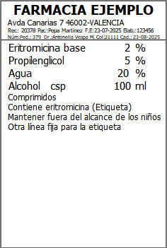 Cabecera etiqueta: (Depende de la longitud del nombre de la farmacia y de si tiene un logo asociado) Dirección etiqueta: 6 Texto fórmula etiqueta: 8 (o tal vez 7)