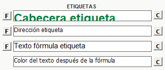 Los tres últimos cuadros de texto son los de la etiqueta (Cabecera, dirección, fórmula). Debe seleccionar el tamaño de fuentes apropiado para que quepa en su formato de etiqueta. Para un ancho de 62, un tamaño adecuado con letra Arial es: