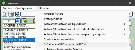 Puede calcular el IBAN y el BIC a partir de los 20 dígitos de una cuenta yendo aquí o bien desde el menú Utilidades del módulo de farmacias: