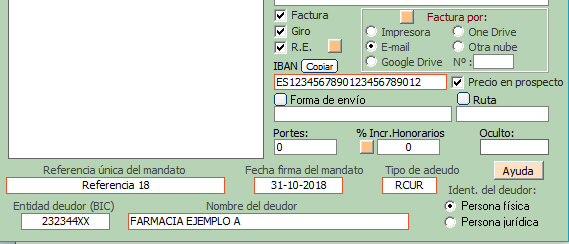 Concepto: contiene información definida por el acreedor (usted) y que la entidad bancaria debe comunicar al deudor cuando adeude la cuenta de su cliente. Es decir es el concepto que la farmacia cliente va a leer en su cuenta bancaria cuando pague la factura. Se pone el mismo concepto a todas las farmacias.