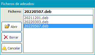 Los ficheros de adeudos (con formato MagisFor) los puede ver desde el módulo de adeudos siempre que quiera. Desde Adeudos, pulse el botón Abrir y aparecerá una ventana con la lista de sus adeudos mensuales (o entre dos fechas).