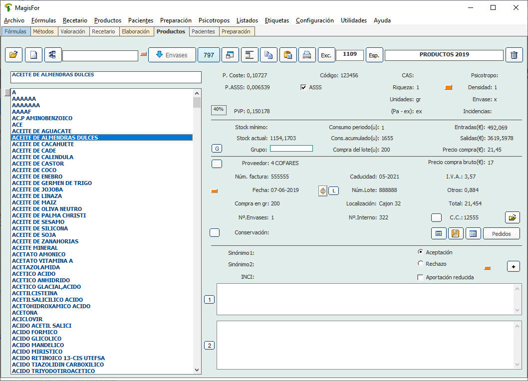 Número interno: Es un número que se genera automáticamente sumando 1 cada vez que se compra un producto. Este número habrá que escribirlo en el envase que hemos adquirido y sirve para su identificación. cada vez que valoremos una fórmula, se guardará en el recetario además del lote del producto, su número interno.
