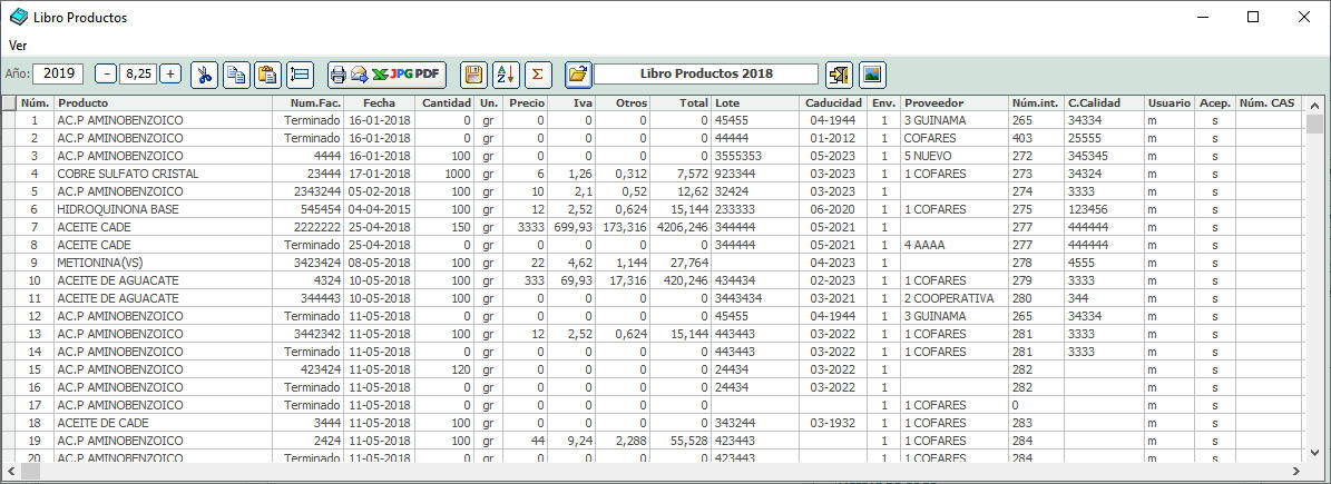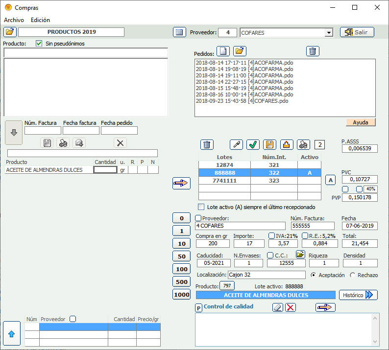 Cada vez que compramos una sustancia, hemos de anotar los datos de la factura, caducidad, lote etc en su ficha. Para ello se pulsa el botón Compra (botón de color amarillo) y se van introduciendo los datos. Al terminar se pulsa el botón Aceptar y es entonces cuando se actualizan los precios de coste, el PVP, los stocks etc. También el programa nos preguntará si queremos anotar la compra en el Libro de recepción de productos. La imagen que aparece más abajo es la vista de un trozo del libro de recepción de productos. Aparecen todos los datos de la compra y algunos más.